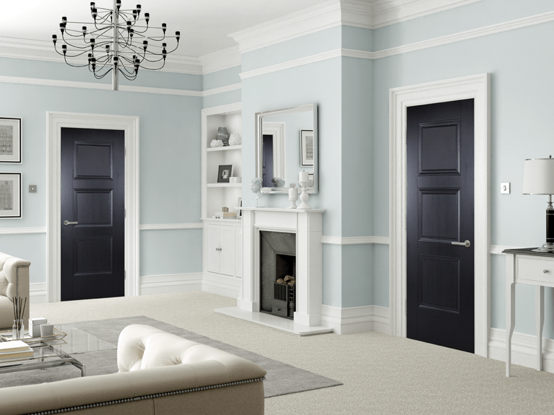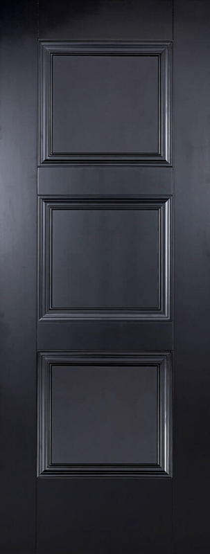 The traditional three panels of this door design is highlighted by a sophisticated primed black finish.