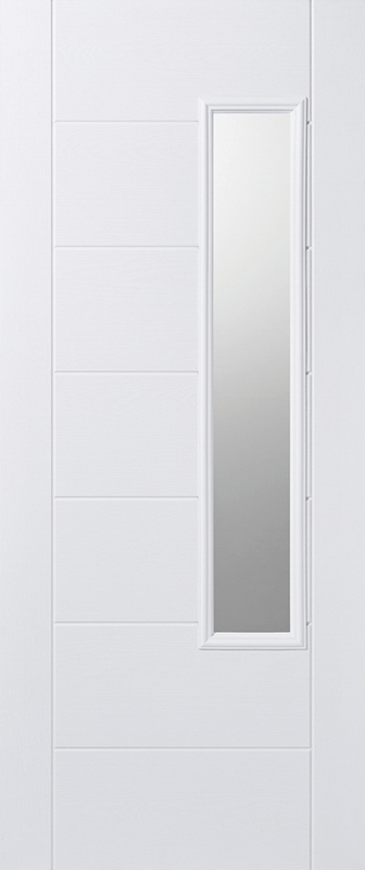 An attractive modern choice, this Newbury door is designed with a frosted double glazed panel, raised moulding and a white finish.