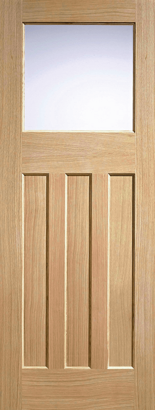 This 30’s style door design features one frosted glazed panel with three rectangular inset panels below in an unfinished Oak.