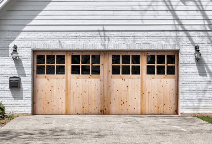 Crafted from a wonderful redwood material, this garage door design features single glazed panels and a z-brace design on the reverse.