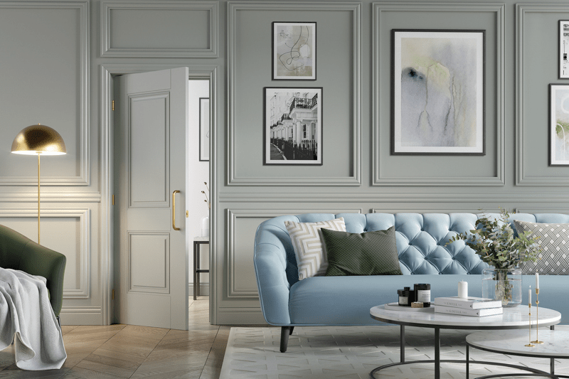 A sophisticated white door design formed by two panels, one larger and one smaller, surrounded by decorative beading.